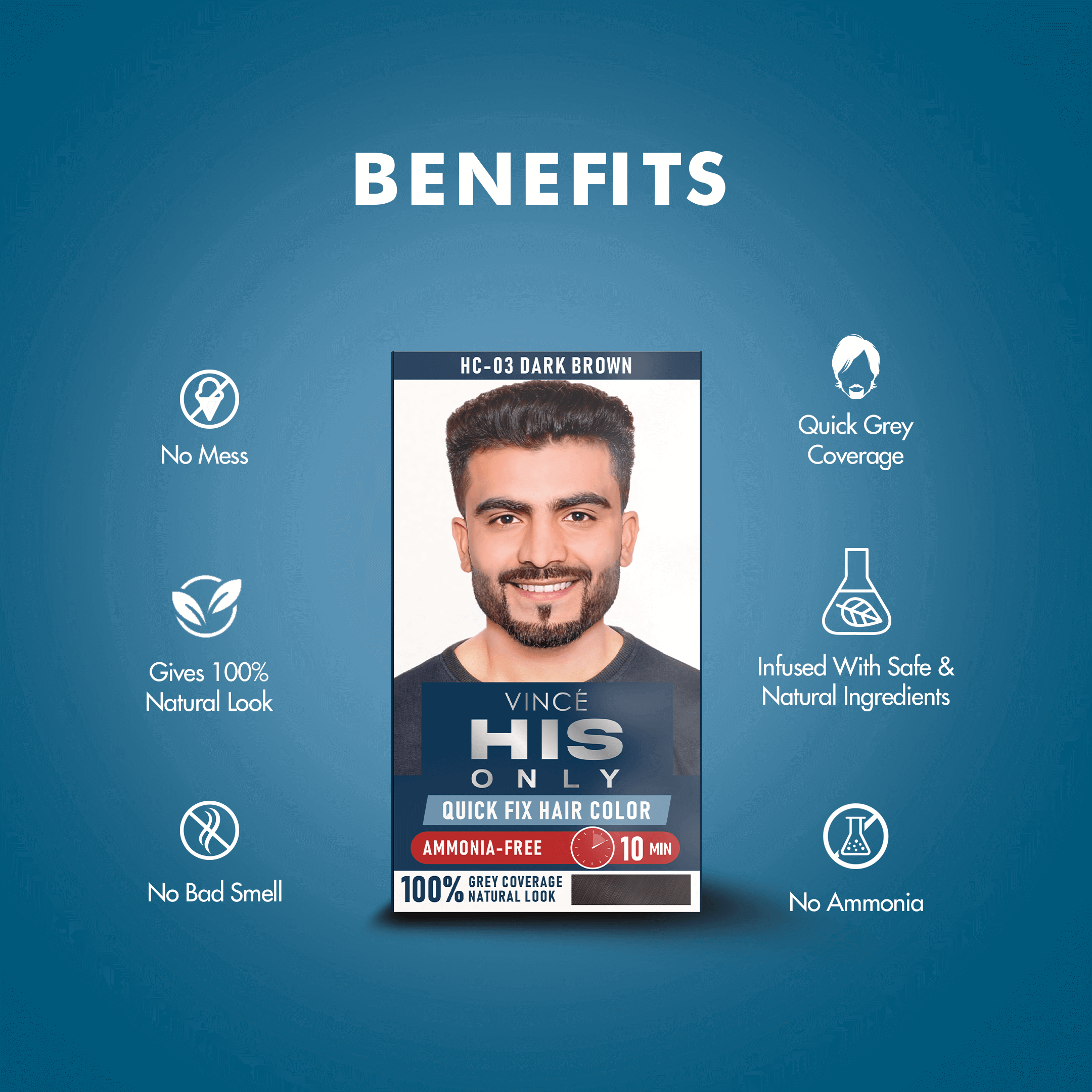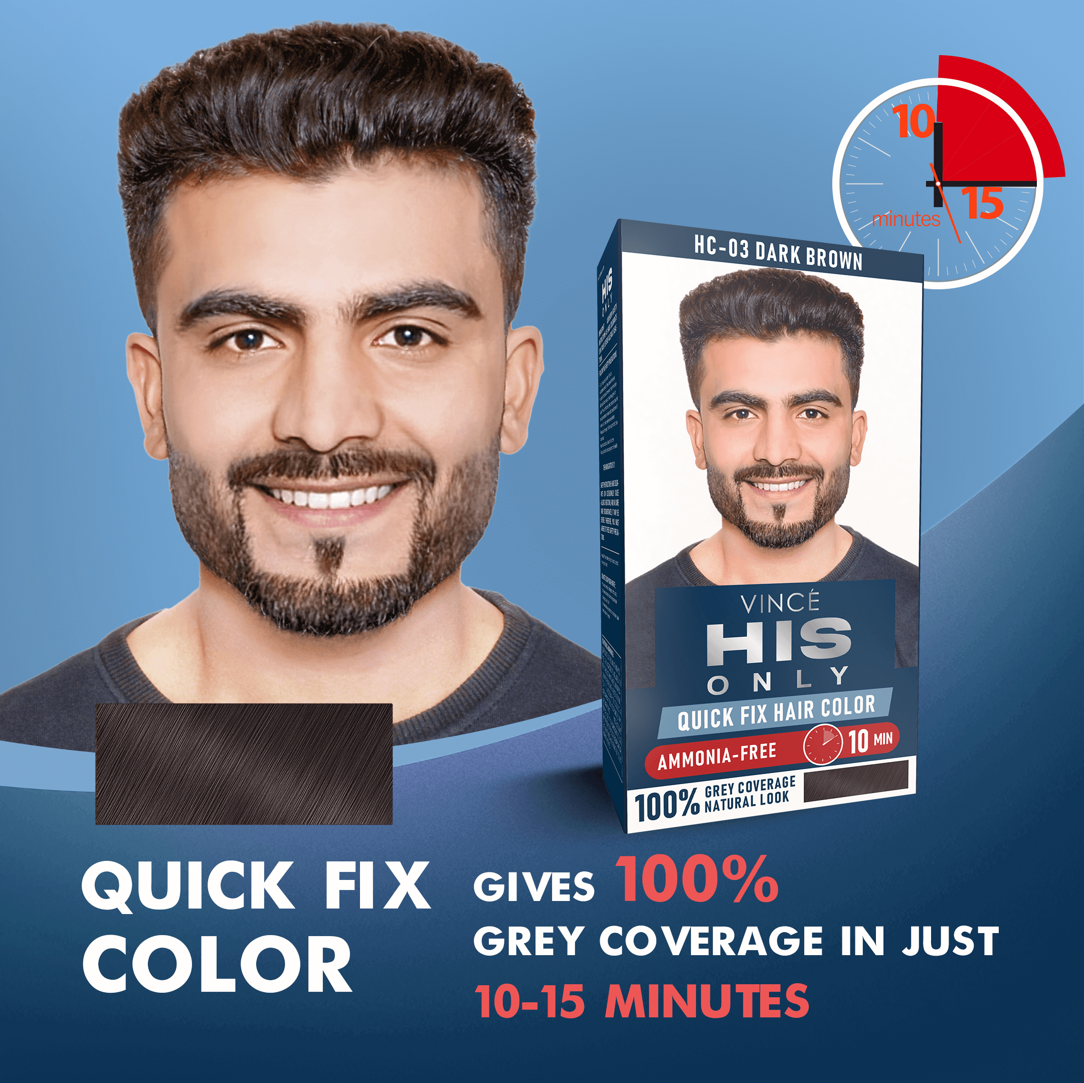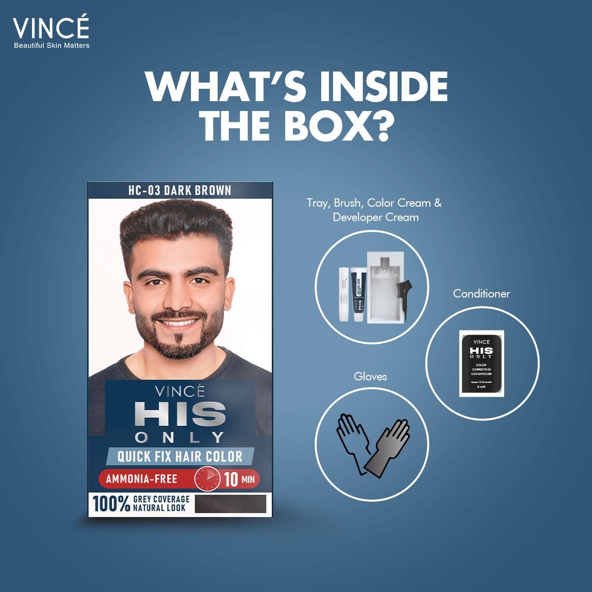 This Hair Color contains no ammonia, no harmful chemicals and does not have any unpleasant smell that can irritate during the application. Vince HIS ONLY men hair color is an exclusive formulation for quick color transformation to give you a natural look without causing any irritation. It contains an advanced blend of Olive Oil, Avocado Oil, Cocoa Butter and Vegetable Protein that offers high-end and speedy coverage for grey hair from the root to the tip in just 20 minutes