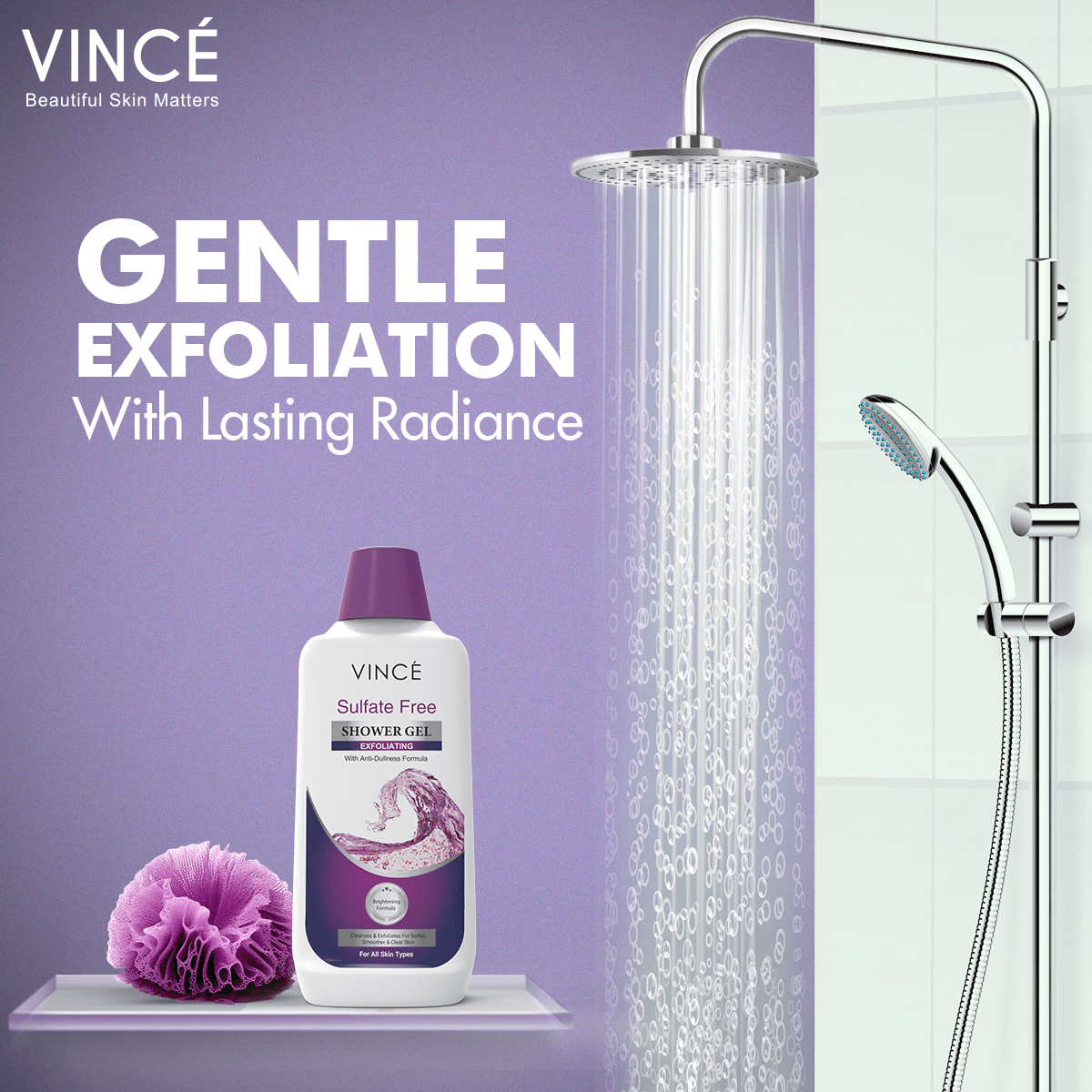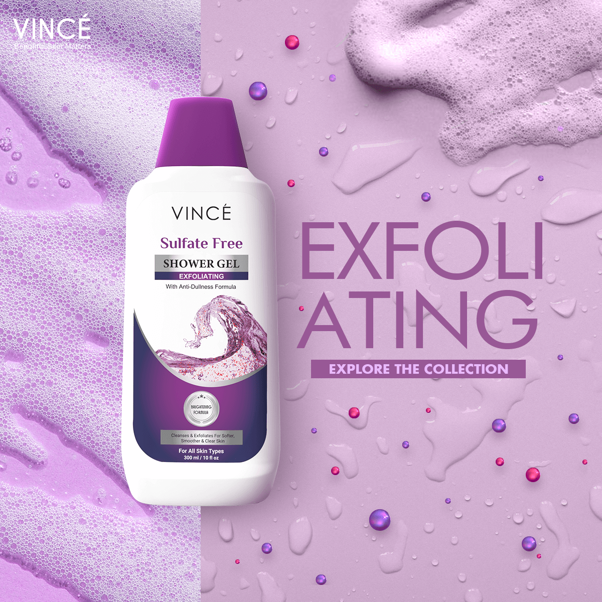 Exfoliating Shower Gel: VINCÉ Exfoliating Shower Gel is designed to deeply exfoliate the dead epidermal cells right underneath the skin layers. This revolutionary Sulfate-Free shower gel is uniquely suffused with the goodness of exfoliating scrub beads, which gently cleanses body skin and helps exfoliate rough & da