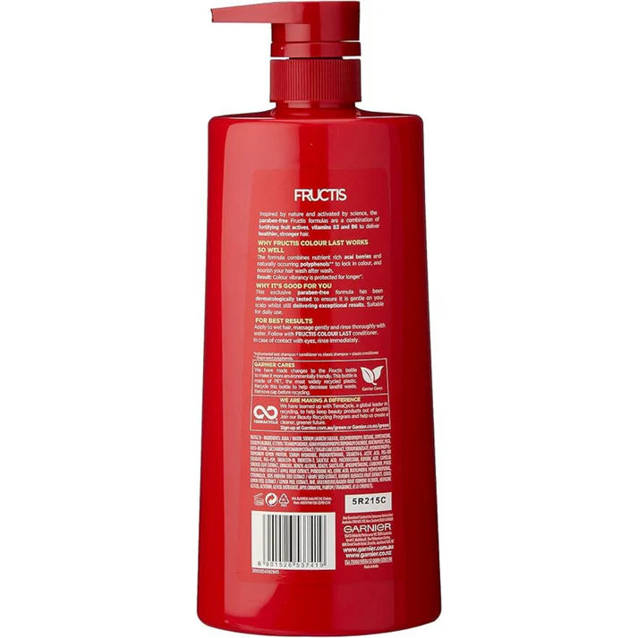 Garnier Fructis Colour Last Shampoo for Coloured Hair (850ml) is specially formulated to help protect and maintain the vibrancy of your coloured hair. Infused with a blend of nourishing fruit oils, this shampoo gently cleanses while helping to preserve the color intensity, keeping your hair looking fresh and vibrant for longer. It works to lock in moisture, smooth the hair cuticle, and protect against damage caused by styling and environmental factors. The shampoo’s rich lather helps to maintain the health of coloured hair, leaving it soft, shiny, and full of life with a refreshing fruity scent. Ideal for anyone with coloured, dyed, or highlighted hair, it ensures your color stays radiant and nourished without stripping it.
