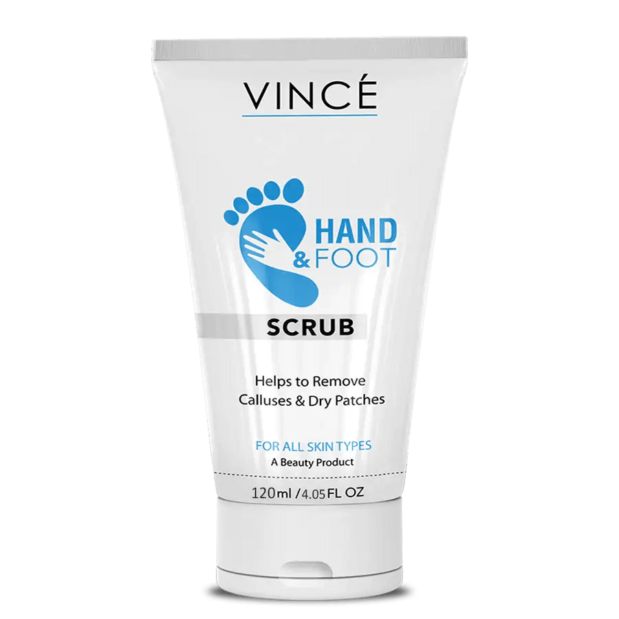 Wash your hand and foot and soak in warm water for 5-10 minutes. Take a small amount of Vince hand and foot scrub, apply it to your hands or feet and massage the scrub on hand and feet in a circular motion for couple of minutes, focusing on the areas like toes, heels, sole and dark knuckles of hands. Rinse off scrub thoroughly with water and gently massage your feet or hands using Vince foot cream or hand cream to keep them nourished.