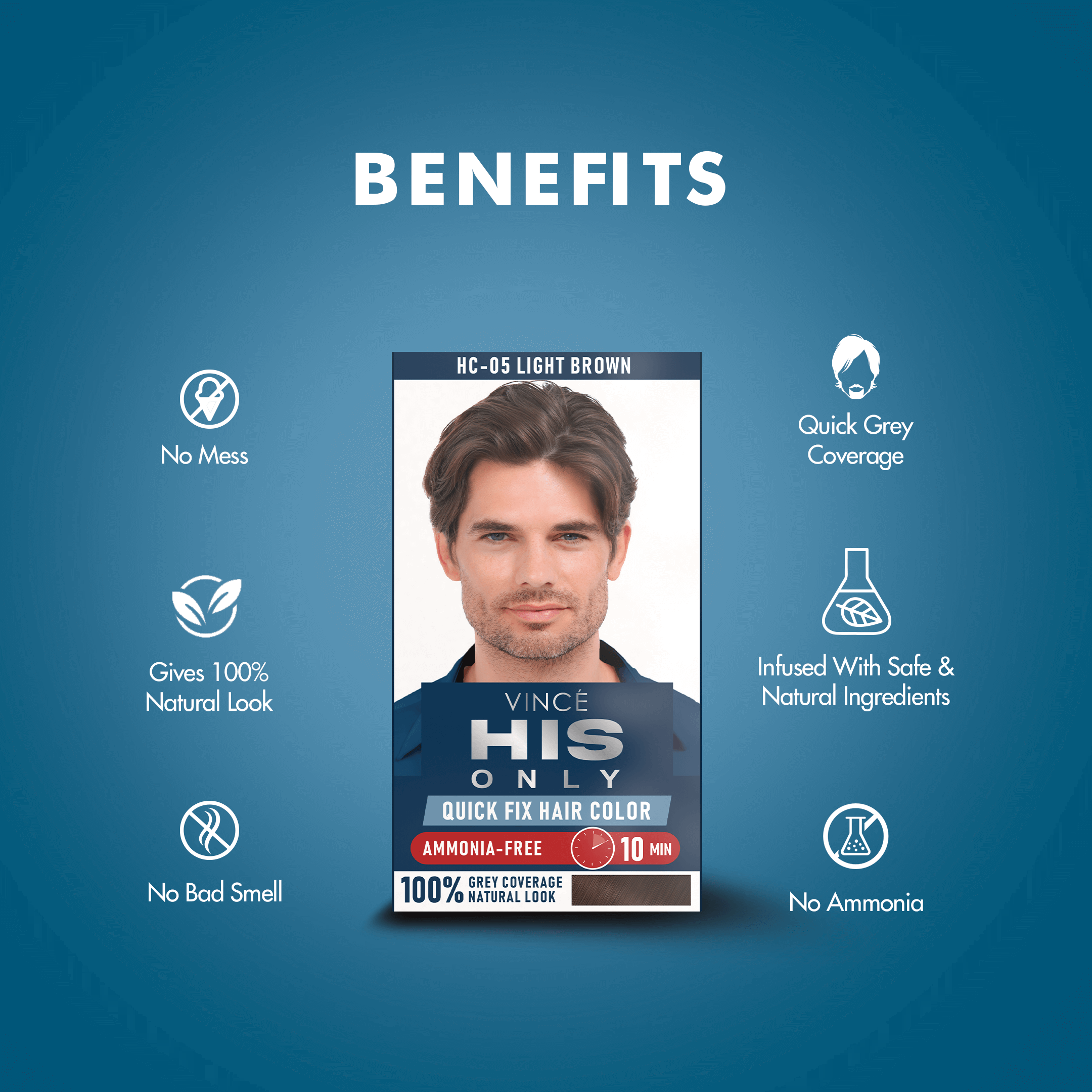 Vince His Only is a gentle formula that gives 100% grey coverage without leaving any residue on the scalp, all while giving a natural appearance and also leaves hair nicely colored and properly conditioned.