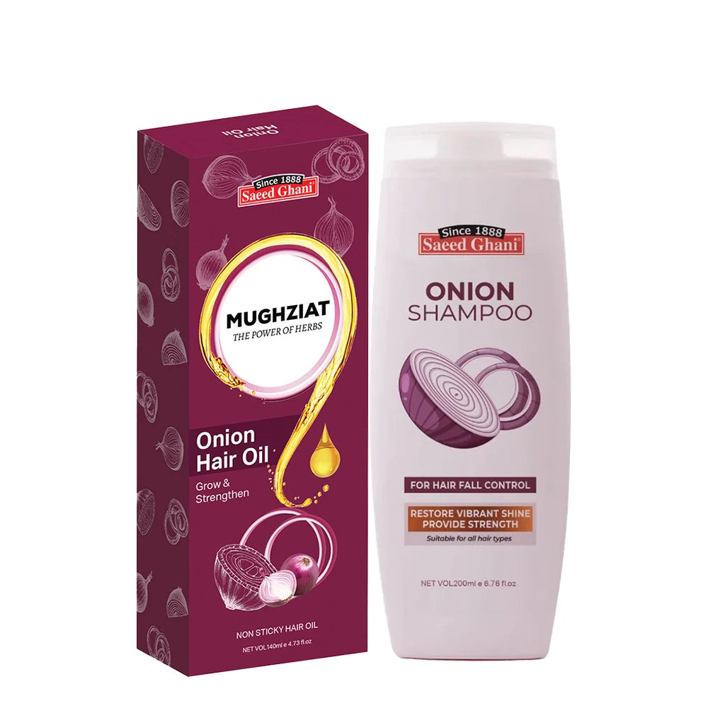 Follow with Saeed Ghani Onion Shampoo, which deeply cleanses the scalp, removes buildup, controls hair fall, and restores natural shine. Together, this duo delivers complete onion-powered care for stronger, smoother, and visibly healthier hair.