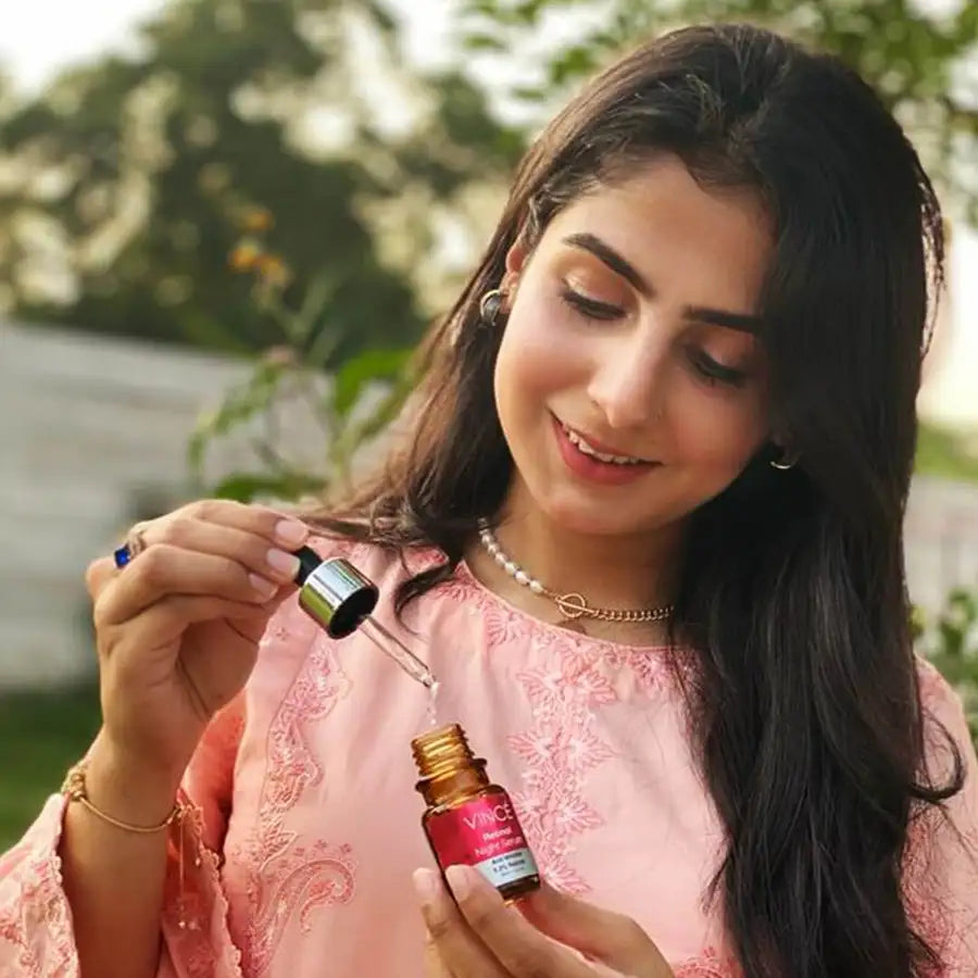 Vince Retinol Night Serum is a powerful age-defying 0.2% retinol-infused serum that gently helps fight against signs of aging, deep wrinkles, fine lines, crow’s feet wrinkles, sun damage, and discolorations. This anti-aging retinol serum also helps to tighten loose skin by lifting effects, improves skin texture, increases skin cell turnover, stimulates collagen synthesis, and promotes a renewed, even-toned, younger-looking appearance.