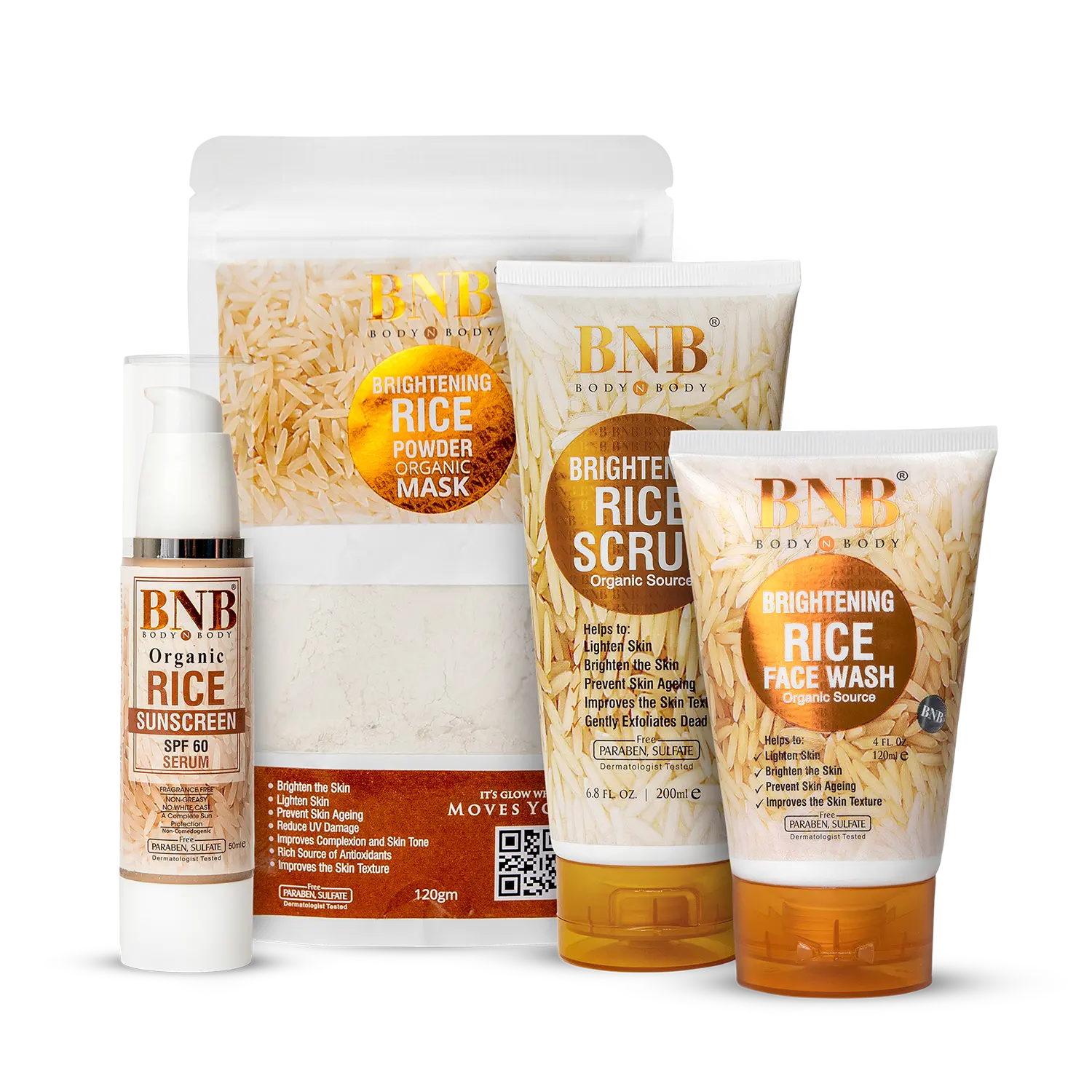 The Rice Renewal Bundle includes Rice Extract Facewash, Scrub, Face Mask, and Rice Extract Sunscreen. This set is designed to cleanse, exfoliate, rejuvenate, and protect your skin, giving you a refreshed and glowing complexion.