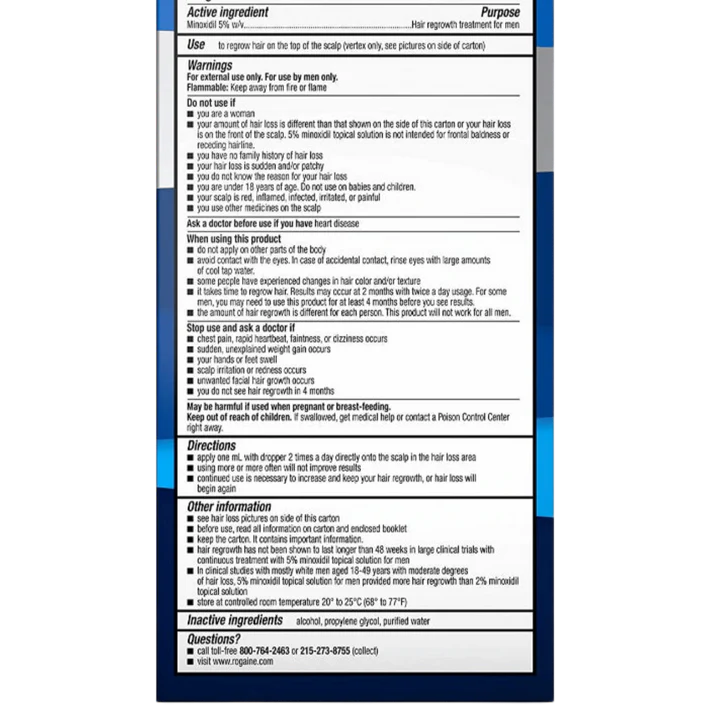 Rogaine's active ingredient, Minoxidil 5%, penetrates the scalp to reinvigorate shrunken hair follicles, extending the hair’s natural growth phase. With regular application, it helps reverse visible signs of hair loss and promotes stronger, healthier strands.